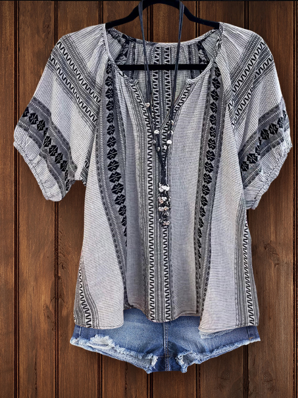 The Abstract Print Double Fringed Top is a stylish and unique piece that is perfect for adding some flair to your wardrobe. With its bold abstract print and double fringed hemline, this top is sure to turn heads and make a statement.